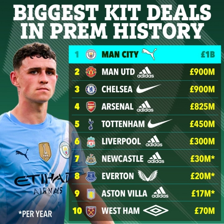曼徹斯特城的合同還超過了曼聯和阿迪達斯簽署的9億英鎊合同,以及皇家馬德里和阿迪達斯之間8年的9.5億英鎊合同,成為足球歷史上最大的澤西島贊助合同。